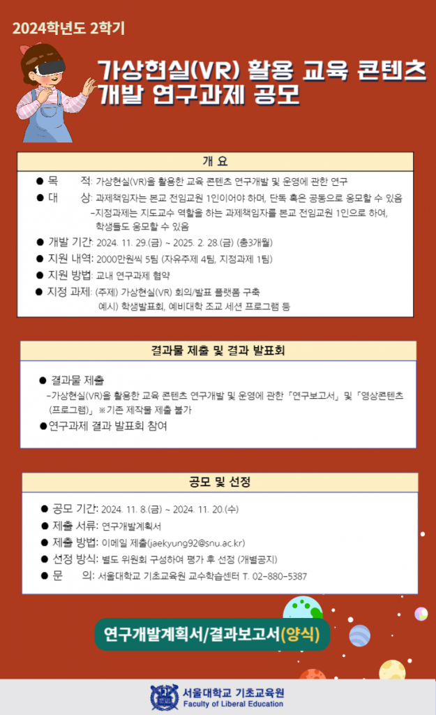 2024학년도 2학기 디지털 전환시대 인재 양성을 위한 고등교육 혁신 사업의 일환으로 「가상현실(VR) 활용 교육 콘텐츠 개발」연구과제를 아래와 같이 공모를 진행하고자 하오니, 관심있는 교원 및 학생의 많은 참여 바랍니다.