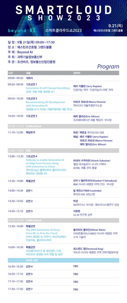 제13회를 맞이하는 스마트클라우드쇼는 올해 ‘Beyond AI’를 주제로 세계적 연사들을 모시고 최근 가장 이슈가 되고 있는 인공지능 기술 활성화에 필요한 인프라, 산업/정책적 투자 등 IT핫이슈를 논의하고자 합니다.