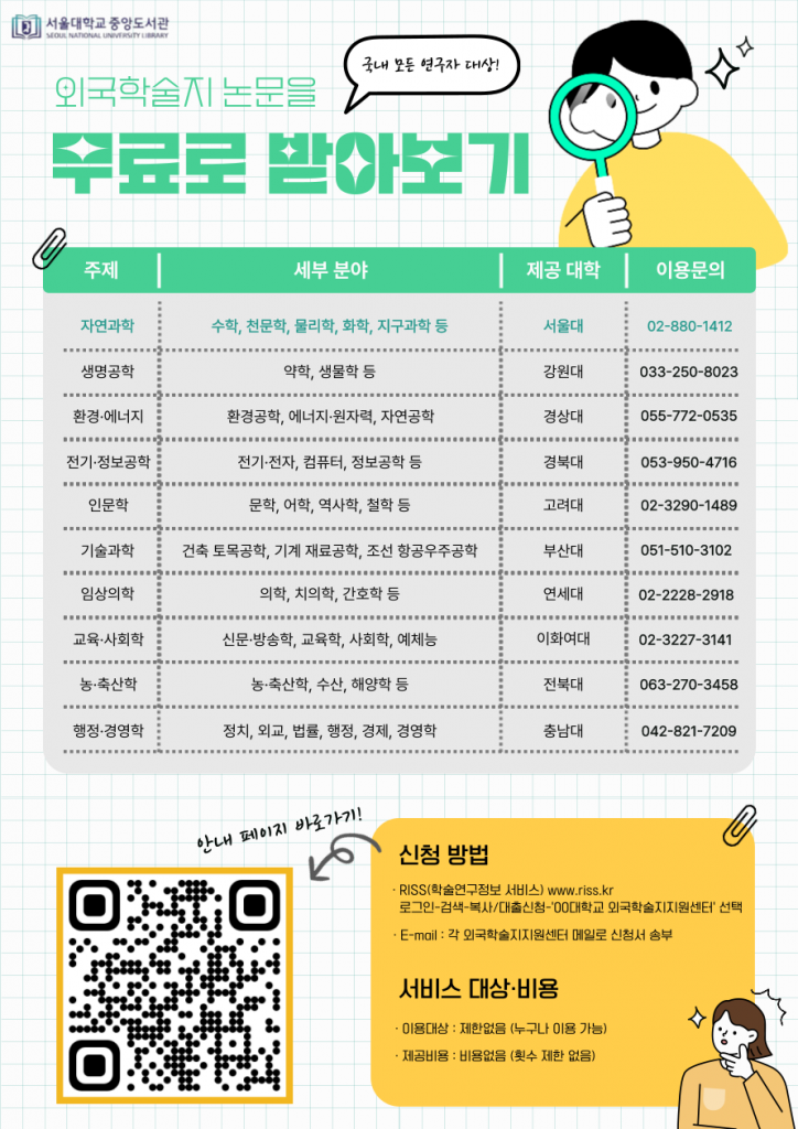 1.서울대학교 중앙도서관은 2009년 자연과학 분야(수학·천문학· 물리학·화학·지구과학 등) 외국학술지지원센터(FRIC)로 선정되어 국내 모든 연구자에게 원문 복사 서비스를 무료(복사비, 배송료)로 제공하고 있습니다.