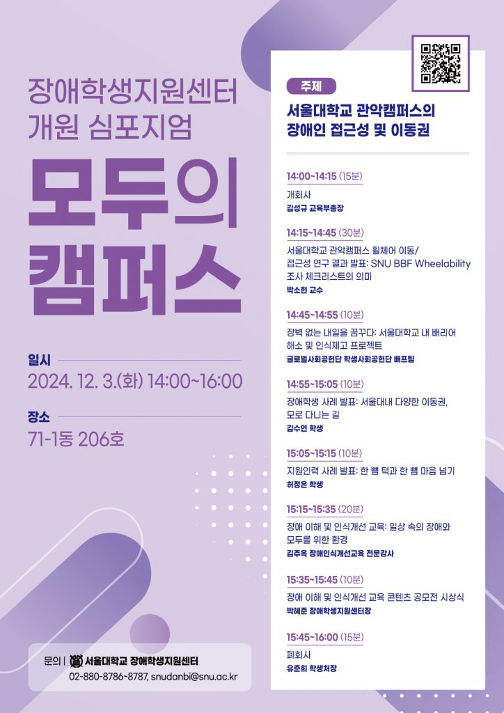 세계 장애인의 날을 맞아 장애학생지원센터 개원 심포지엄 <모두의 캠퍼스>를 다음과 같이 개최하오니, 관심 있는 구성원의 참여 바랍니다.