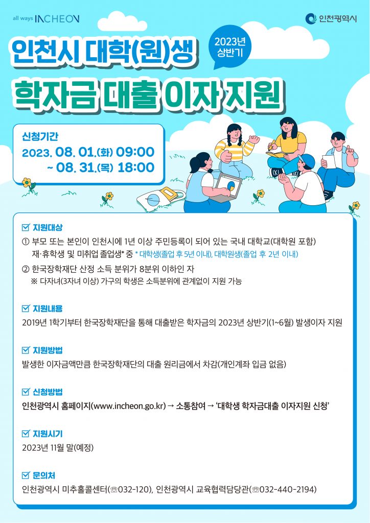 인천광역시에서 2023년 상반기 대학(원)생 학자금 대출이자 지원 사업을 아래와 같이 시행하고 있으니, 해당 학생들이 지원하길 바랍니다.