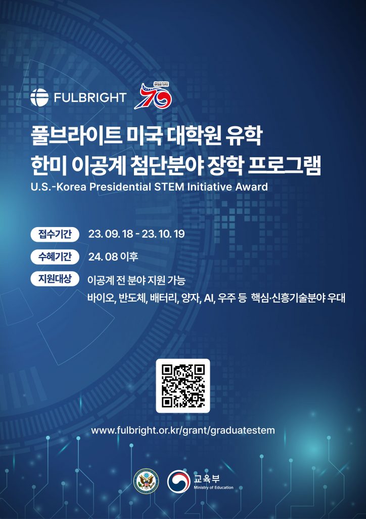 1. 한미교육위원단에서 한미동맹 70주년을 기념해 금년 신설된 [풀브라이트 이공계 대학원 장학 프로그램]을 안내해드리오니 관심있는 지원자는 참여바랍니다.