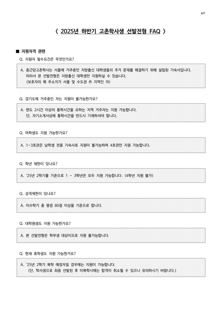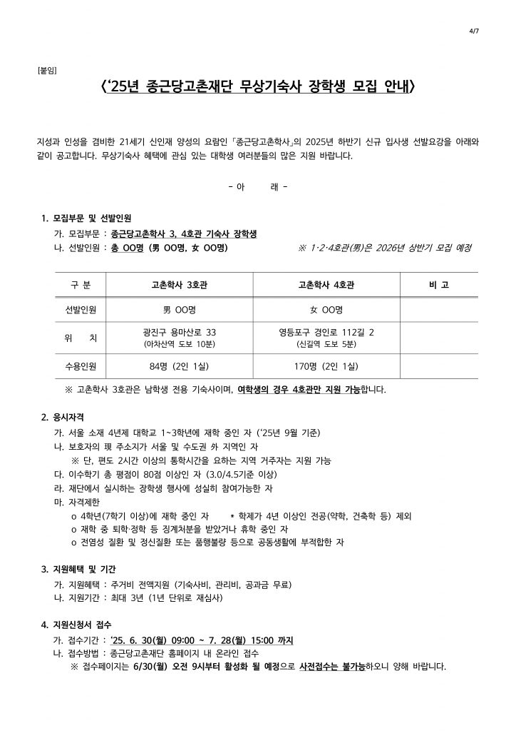 2025년도 종근당고촌재단 무상기숙사 장학생 모집 안내(~7/28 15:00)