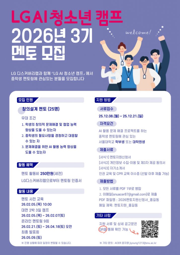 2026년 2월부터 서울대학교 교육종합연구원은 LG디스커버리랩과 함께 ⌜LG AI 청소년 캠프⌟를 시 작합니다. 본 캠프는 참여 학생들이 문제를 발견하고 이를 AI의 활용과 협업을 통해 해결할 수 있는 성 장의 기회를 제공하는 것을 목표로 합니다. 이에 학생들의 창의적 문제 해결 역량, AI에 대한 이해 및 협업 역량 성장에 도움을 줄 수 있는 멘토를 아래와 같이 모집합니다.