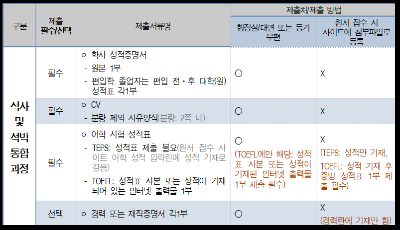 - 공통 제출 서류: (3) CV, (4)성적증명서, (5) 어학 증빙서류 각 1부