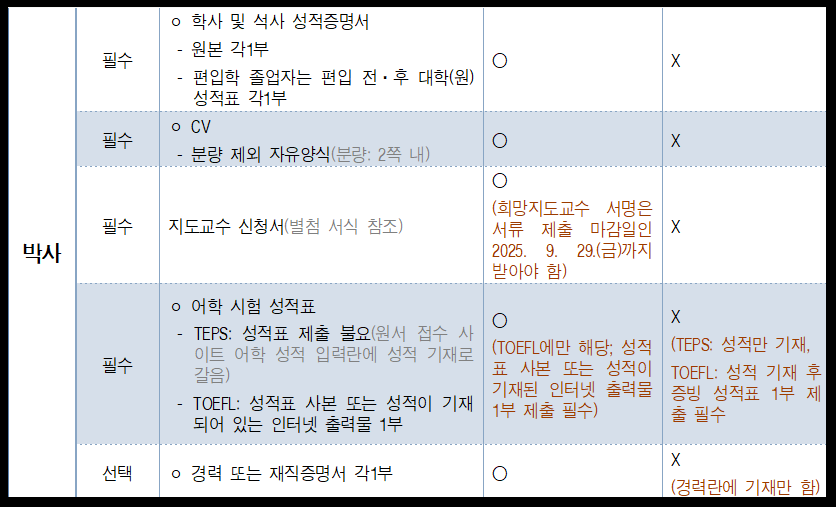 - 박사과정 추가 서류: (6) 지도교수 신청서 (희망 교수와 사전 면담 후 확인 서명 필수).
