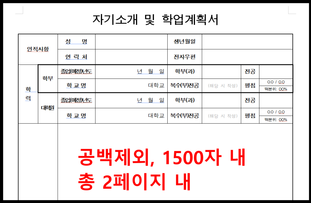- 온라인 제출: (1)입학지원서, (2) 자기소개서 및 학업계획서(※서울대 공통 양식 X, 아래 첨부파일 양식 사용)