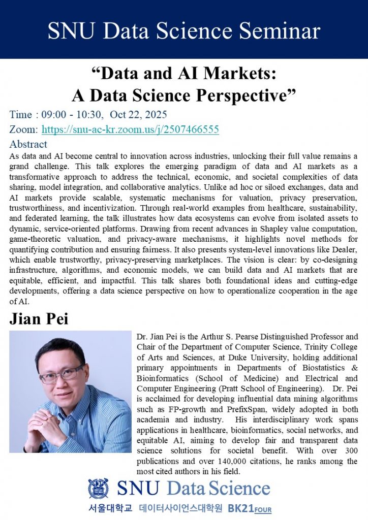 Duke Univ. Jian Pei 교수, Data and AI Markets: A Data Science Perspective, 10월 22일(수)