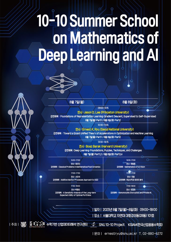 서울대학교 수리과학부에서 ‘Mathematics of Deep Learning and AI’라는 제목으로 summer-school을 개최하니 관심있는 학생은 참여바랍니다.
