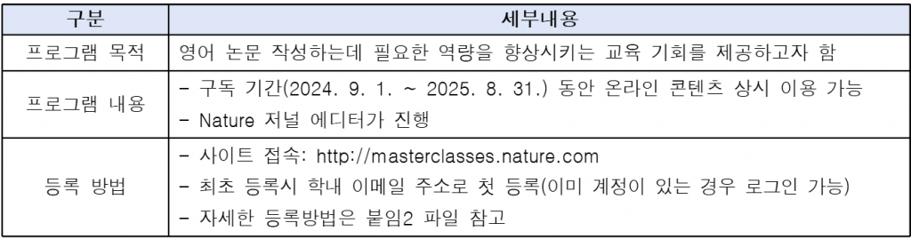 서울대학교 기초교육원원에서는 4단계 BK21 대학원혁신사업의 일환으로 대학원생의 국제 연구역량 강화를 위하여 ‘Nature Masterclasses-SNU 프로그램’을 운영하고 있습니다.