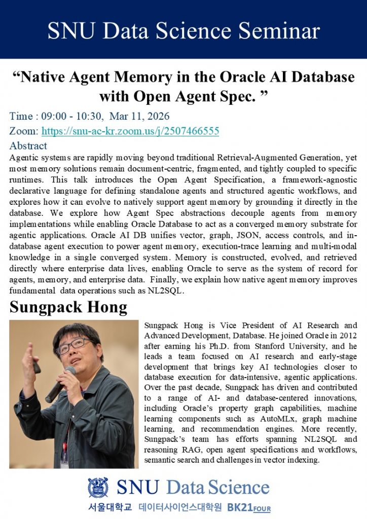 이번 주 데이터사이언스 세미나 연사는 Oracle Labs에서 Advanced AI R&D를 이끌고 있는 홍성백 박사입니다. 홍 박사는 이번 강연에서 Open Agent Specification 기반 Native Agent Memory의 개념을 소개하고, 데이터베이스 중심의 에이전트의 메모리와 워크플로우를 통합하는 새로운 접근 방식에 대해 설명합니다.