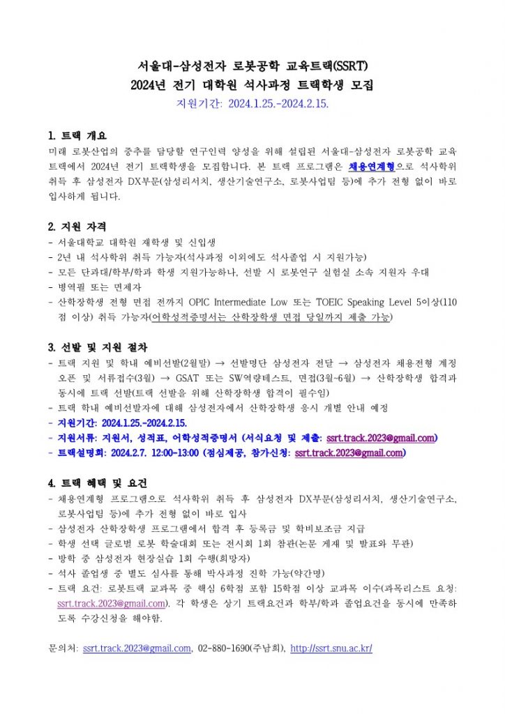 2024년 전기 대학원 석사과정 트랙학생 모집